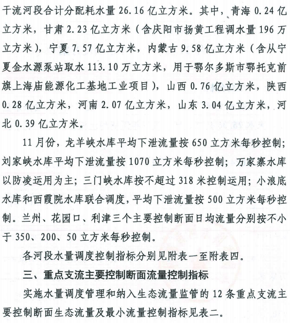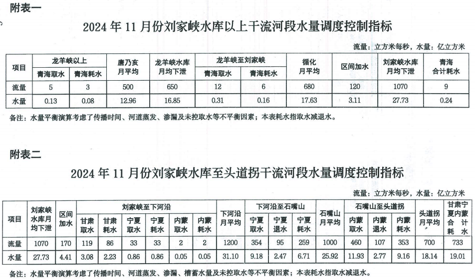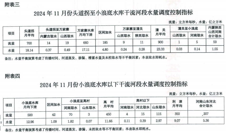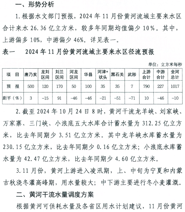 2024年11月份黄河水量调度方案