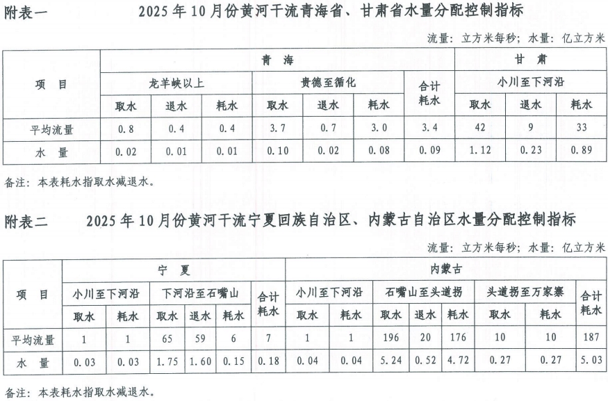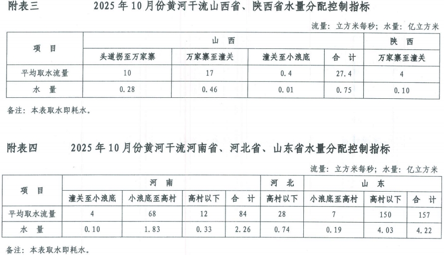 2025年10月份黄河干流水量调度方案