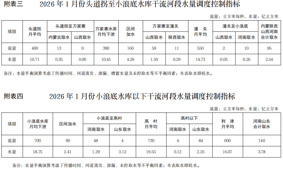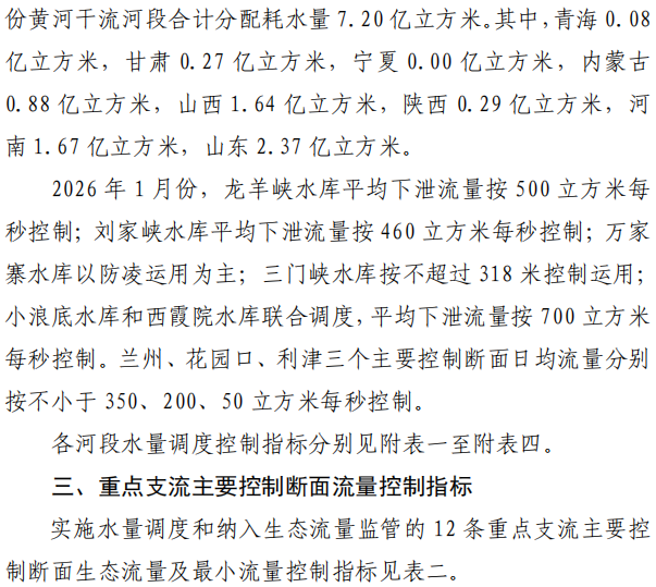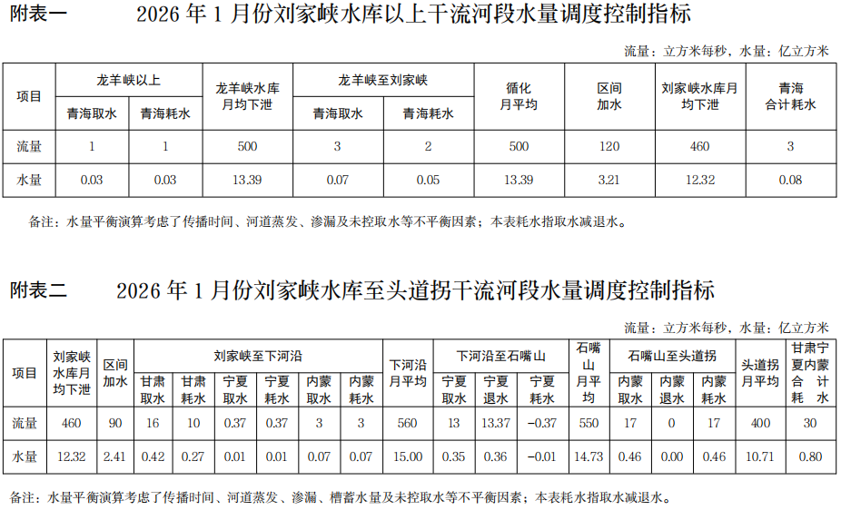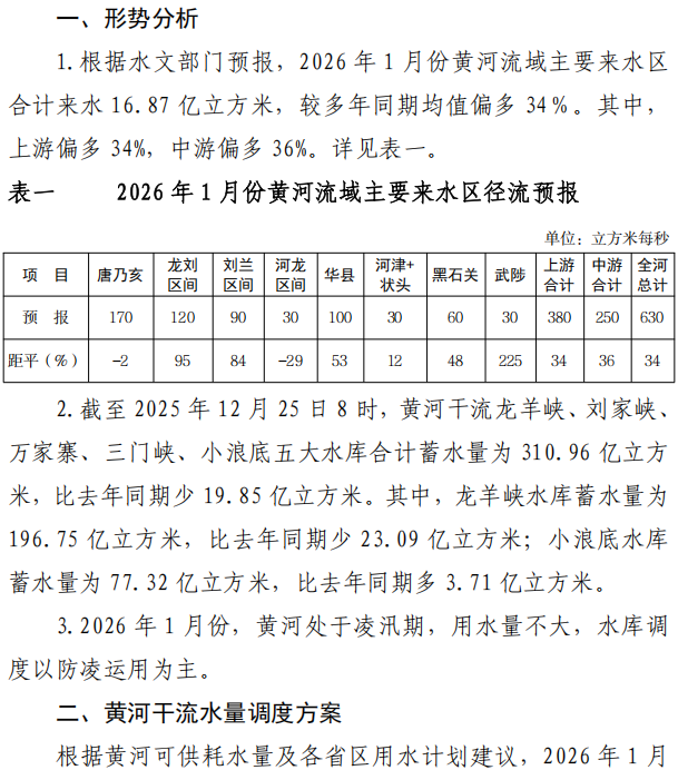 2026年1月份黄河水量调度方案