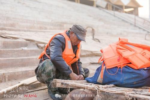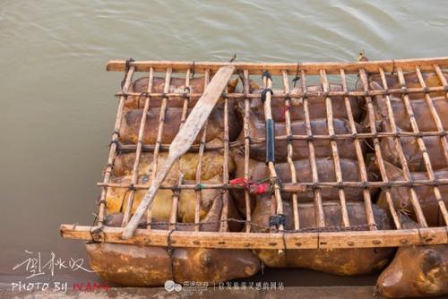 顺着码头往前走,师傅们已经开始从仓库中搬运出我们要乘坐的羊皮筏子。只见一个个精致鼓鼓的羊皮囊,像一颗颗红宝石,被绳子牢牢绑在木条制作的框架上。仔细数数,5-4-5 三排,一共 14 个羊皮囊。据说这是最小型也是最常见的,而最大的羊皮筏子,有近 600 个羊皮囊组成,可谓壮观。