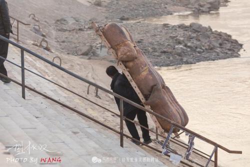 冬天的黄河,是最清澈的时候,在阳光的照射下,呈现着与记忆中不同的蓝绿色。在码头的尽头,矗立着一块石碑,上面写着 " 黄河之水天上来 "。却是,正是由于这奔流到海不复回的黄河,才迫使人们想到了用羊皮来做筏子。