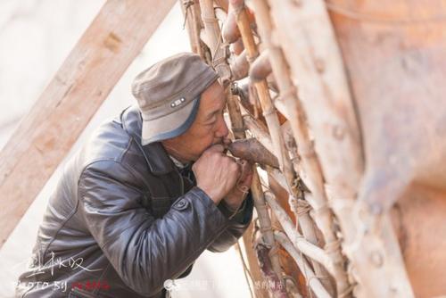 师傅们把筏子背到河岸,并没有急着把它放入河中,而是竖立在岸上,一个个检查羊皮囊是否都充满了气。如果发现气不足的,还会打开绳子,往里面吹起。这时,电影中成龙吹羊皮筏子的场景真实地呈现在了眼前。据说当地有句俗语,叫 " 请你到黄河边上去 ",用来讥讽夸海口的人,意思就是让他去吹羊皮囊。