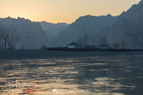 " 纵一苇之所如,凌万顷之茫然 "。坐上羊皮筏子的我们悠闲的在黄河上随波逐流,两岸的风景也像巨幅画卷般展开。时值日落时分,阳光将最后一点余晖洒在岸边黄河石林的山尖上。岸上一眼望不到边的枣树林已难见枣子的踪影,深冬时节,到处都是深黄和浅灰。四周和身下就是宽广的黄河,滔滔黄河水载着千年的沉重滚滚而去。这样的场景,可能只在梦中见过。
