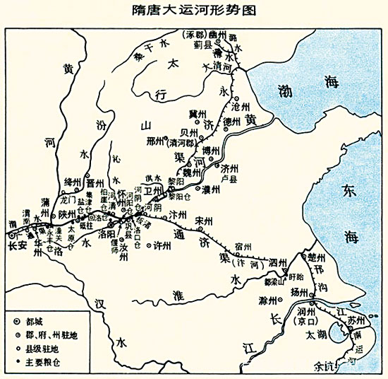 公元581年隋建立,结束了中国长期分裂的局面,国家复归统一。其时,黄河下游河道经今河南荥阳、原阳、新乡、卫辉、滑县、濮阳,山东鄄城、莘县、阳谷、聊城、惠民、博兴等地,东注渤海。为加强京师长安与各地的联系,充分利用黄河的水源优势,进一步开凿运河,大力发展水上交通,把江南地区的粮食和生活用品运输至京师,成为隋王朝的一项急迫任务。