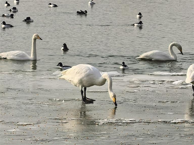 “慢一点,把玉米撒在浅滩边缘,别惊扰到正在进食的天鹅。”市林草局动管科副科长王超站在湿地栈道旁,轻声叮嘱着志愿者。身着红色马甲的志愿者推着装满玉米的编织袋,沿着划定的投食点缓缓前行,将颗粒饱满的玉米撒在未结冰的水域与滩涂交界处。不远处,几只大天鹅警惕地观察片刻,便低头啄食起来,偶尔有调皮的鹊鸭扑腾着翅膀滑行,溅起细碎的水花。渔鸥的鸣叫声、大天鹅的引颈声交织在一起,打破了冬日的静谧。摄影爱好者们架起“长枪短炮”,捕捉着候鸟灵动的瞬间。