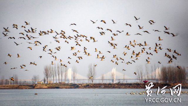 近日,封丘县陈桥镇黄河滩区,国家二级保护动物灰鹤大批聚集于此,它们时而在水中栖息,时而空中盘旋,场面蔚为壮观。多年来封丘黄河河务局加大对黄河生态的保护力度,黄河滩区生态环境和候鸟栖息环境明显得到改善,宽阔的河滩,滚动的河流,浓密的草地,飞舞的灰鹤,勾勒出一幅幅美丽的黄河画卷。