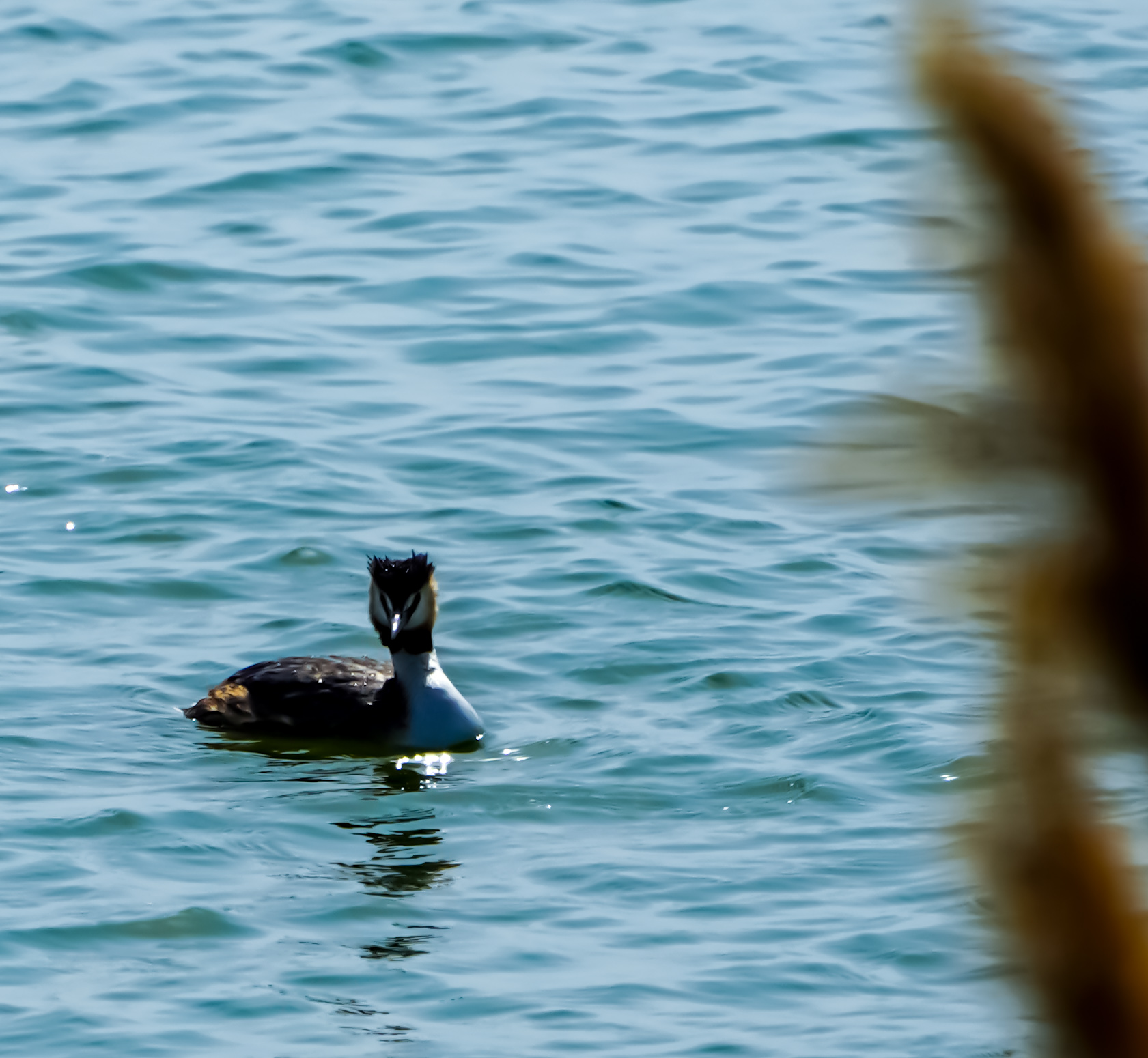 国家二级保护动物凤头鷿鷈在湖面遨游.jpg