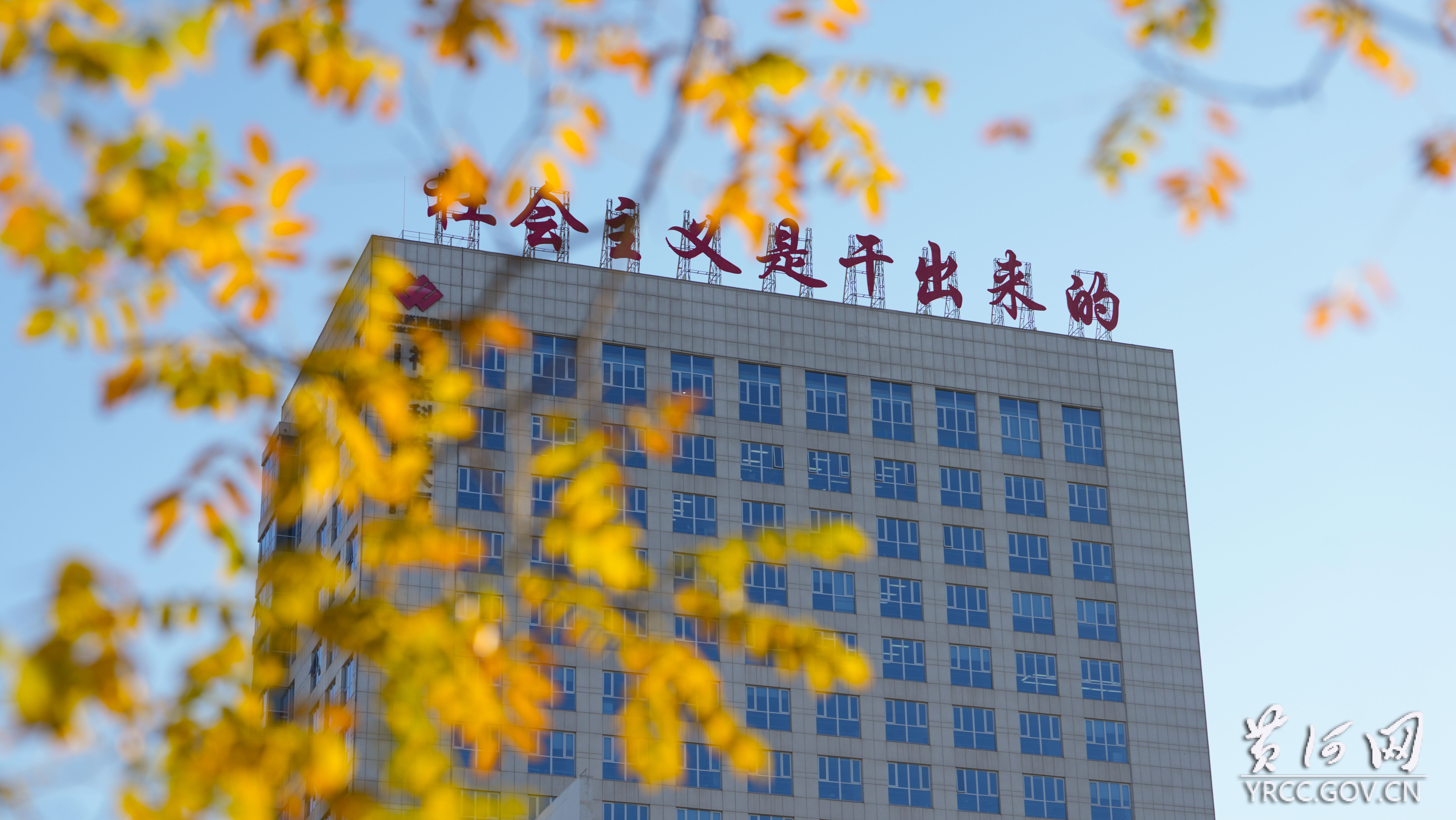 秋日晴空下,金黄树叶掩映中,楼宇顶端 “社会主义是干出来的” 红色大字格外醒目,既传递出拼搏实干的精神力量,又与烂漫秋景相映,尽显生机与奋进之美。