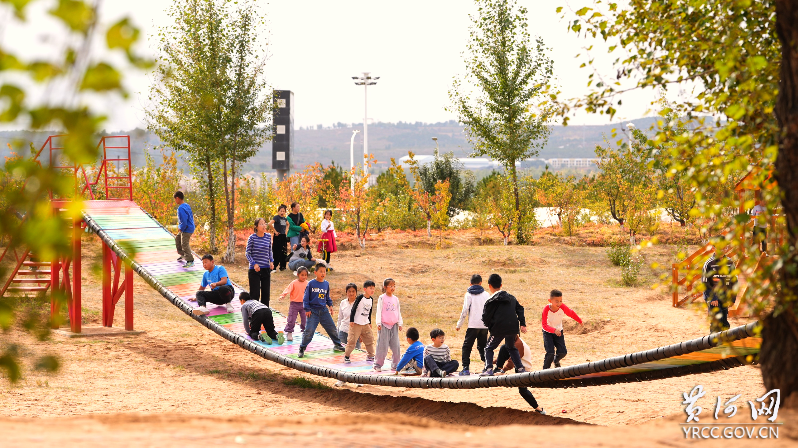 在神东哈拉沟生态示范基地,游乐设施上孩子们尽情嬉戏、共享欢乐,周围树木晕染出斑斓秋意。