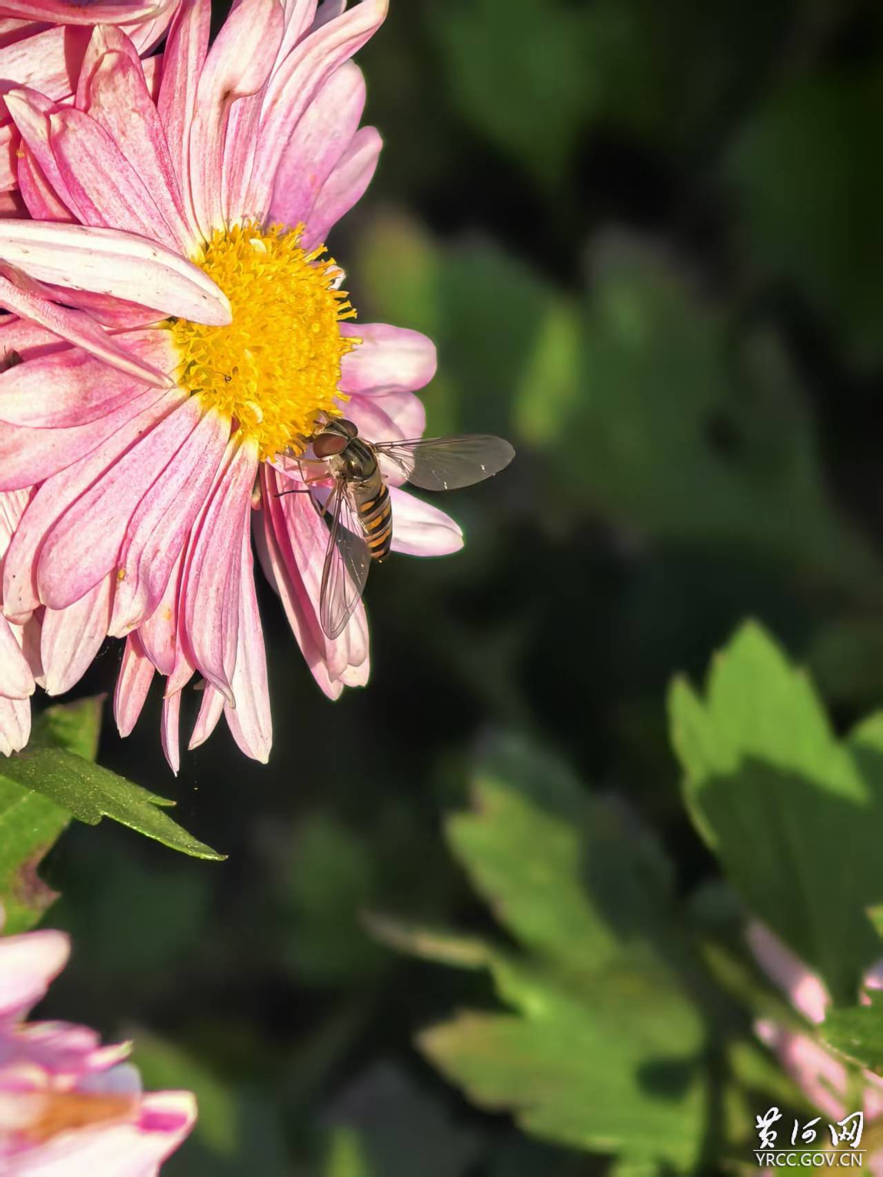坝脚边更是藏着小惊喜,粉色菊花肆意绽放,引得“生态灵动使者”——食蚜蝇翩跹而至,它既为花儿传粉,又捕食蚜虫,勾勒出“花虫共生”的鲜活图景。阳光洒下时,与围坝的硬朗、花木的柔美相映成趣。