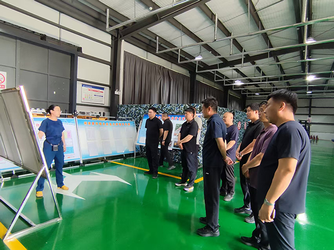 在庭院的小路上,刘倩身着“黄河蓝”工装、手持扩音器,正带领着学习交流团在段上参观。