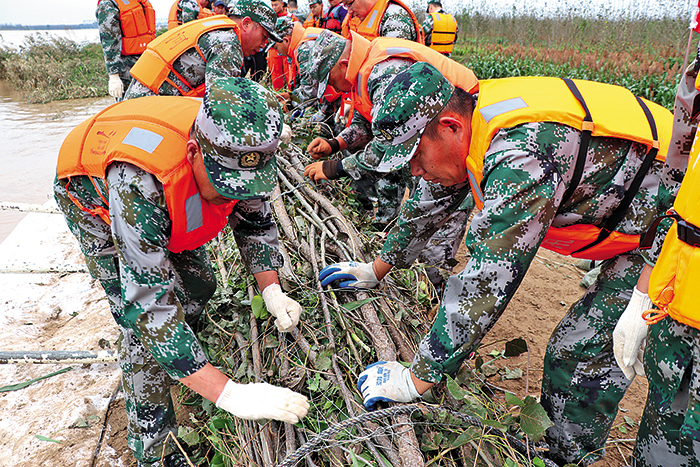 2021年黄河秋汛期间,山东河务局职工捆柳石枕