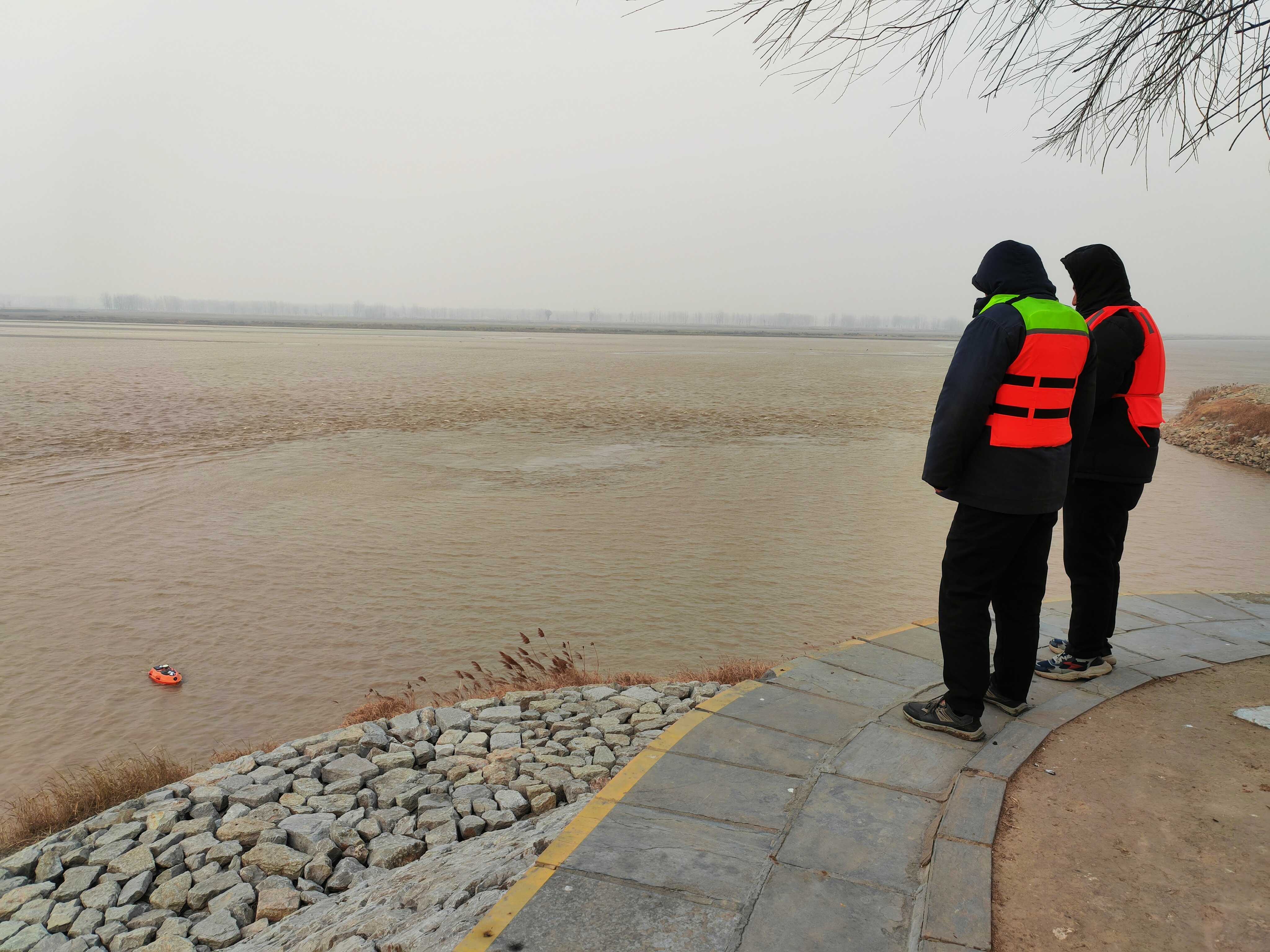 20分钟,1道坝、7个断面,探测完毕。数据实时回传系统平台。张宪君与同事化占鹏收起设备,沿堤向上游走去,身影渐融于黄河岸边的苍茫之中。