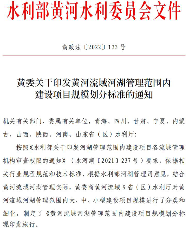 黄委关于印发黄河流域河湖管理范围内建设项目规模划分标准的通知