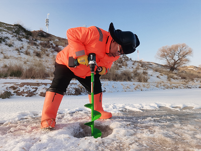便携式电动打冰机,顾名思义,电力驱动、体形小巧、方便携带,相较于人工手动冰钎凿冰,既方便、又快捷,开凿一个冰孔只需一两分钟。