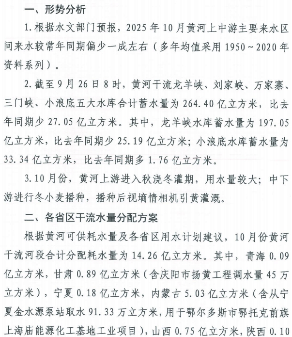 2025年10月份黄河干流水量调度方案