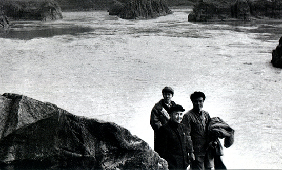 1952年王化云(前左1)查勘三门峡坝址,身后三道激流自左至右分别是鬼门、神门、人门