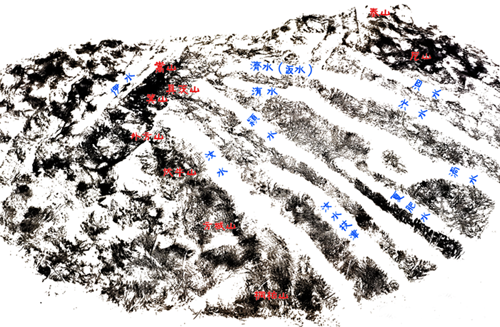 在具茨山老山坪,有一幅大型线条岩画,构图酷似远古水系图,多位水利史专家倾向于将其简称为“大禹导淮图”。该图刻于一块长方形巨石斜面上,左上标示伏牛山脉,与黄河流域区分明确,重点均在淮河流域,涉及沙水、汝水及其支津、颍水、夏肥水、涡水、睢水、汳(汴)水。对照清代杨守敬《水经注图》,河道走向、长短、分布高度吻合。画面主体刻有九条大致平行的河流,均为淮河干流北岸支流,自西向东依次为滍水、汝水、汝水枝津、颍水、夏肥水、涡水、睢水等,其中“涡水”中游还有一圈明显的“环城河”,围绕着城池或低丘。最东面的两三条河名称选项较多,可能是汳水(汴水)、泗水等。尽管黄河夺淮对淮北水系冲击很大,但河流总体格局与今日淮河流域图相比,没有颠覆性的改变,越偏西的河流路线越稳定,越好辨认。
