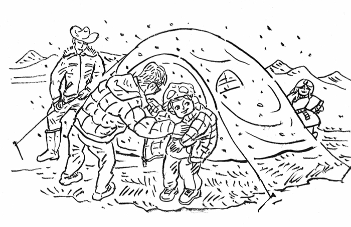“要下雪了!”达瓦望了一眼北边的天空,说道,“快,把帐篷搭起来,正好喝点水、吃点东西。”
