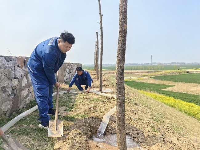 该管理段坚持科学规划、适地适树原则,提前勘探淤背区土壤条件,精选耐旱易活、适应性强的优质树种。种植现场,职工采用石灰按照“横平竖直、整齐划一”的原则定好种植坑位,植树过程中分工协作,严格按照标准化流程作业,确保苗木成活率。为巩固绿化成效,该管理段同步建立管护责任制台账,明确专人负责后期浇水、防寒、病虫害防治等工作,形成“植、管、护”全链条闭环管理,实现“植一棵、活一棵、成一片”。