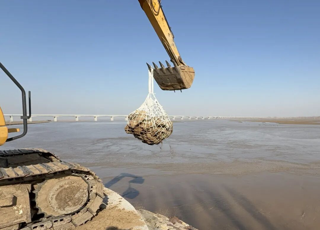 本站讯 1月7日,黄河开封黑岗口河段岸边,挖掘机铁臂舒展、精准起落,一兜兜满载防汛石料的网兜呼啸而下,稳稳扎根岸坡。这是河南河务局储备中心最新采购的聚丙烯新型防汛物资“抛石网兜”,实战测试显示,每兜抛投作业平均用时仅3分钟,较传统铅丝网片作业效率提升超70%。
