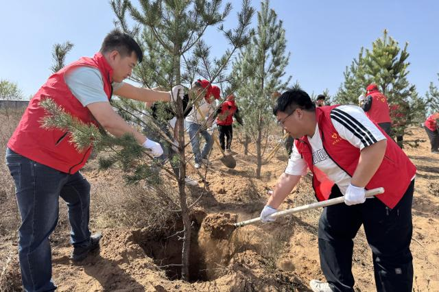 神东员工和大柳塔镇党政机关及驻镇单位、神木市实验中学等约1500人参加此次义务植树活动,企地人员携手挥锹播绿,为矿区添新颜。