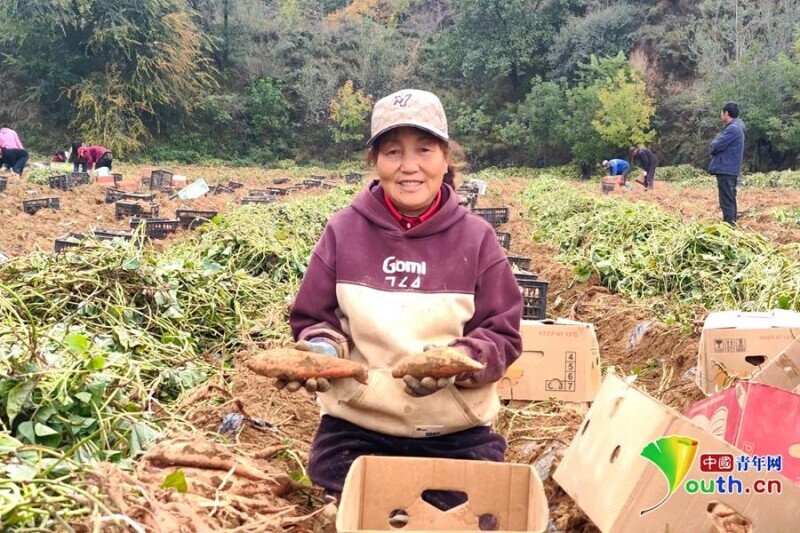 护好一方水土,富了一方百姓。不远处的梁峁田地里,正上演着丰收的热闹场景:翠绿的红薯藤蔓堆满田垄,农户们正将刚挖出的红薯擦去浮土,麻利地码进纸箱。据当地农户透露,红薯每年的销量可观,“都能全部卖完,销往全国各地。种植期间,人工配合机械化作业,效率也提升了不少。最近这些年,生态环境改观比较大。”