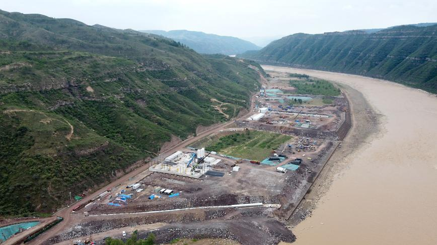 日前,山西省吉县黄河古贤水利枢纽工程施工现场,紧张的施工场景与奔涌不息的黄河水构成一幅生机勃勃的壮丽画卷。