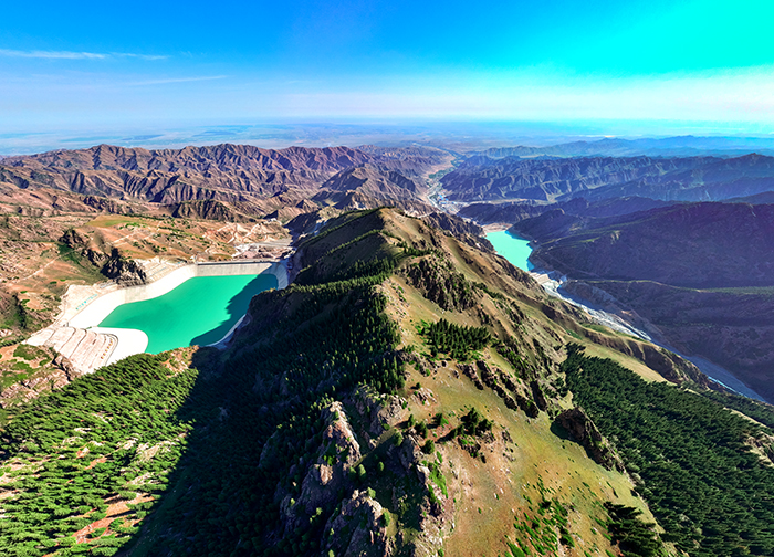 初秋,天山山脉层林尽染,深翠渐浓。记者沿山路驱车而上,行至山顶,只见两座碧绿水库一高一低,遥相呼应。
