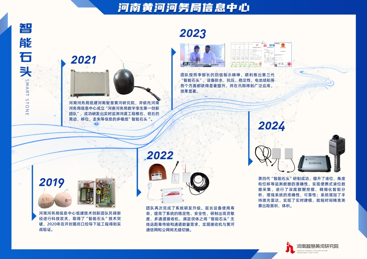 作为水利部成熟适用水利科技成果推广项目,“智能石头”在黄河河南河段20处重要工程208道坝岸布设2000余个点位,全天候实时监测坝岸险情,预警运行成果显著。近两年黄河调水调沙期间,“智能石头”共发出预警告警信息428次,准确监测一般险情35坝次,实现了“发现即定位、定位即处置”的精准防控。同时,作为数字孪生黄河建设的一个基础应用,该成果还在山东、山西境内重点工程项目推广应用,并正式走出黄河流域,在南水北调中线工程拒马河畔落地,开启了多流域、多场景监测的新篇章。