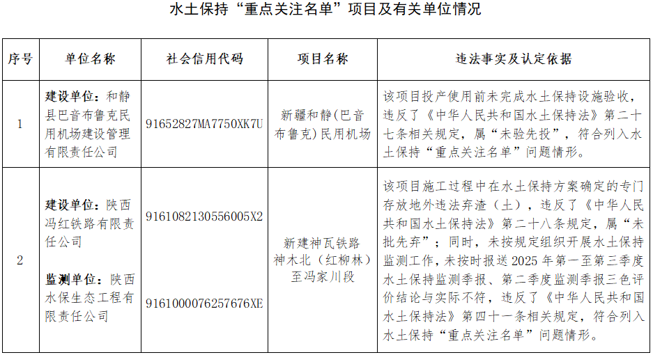 经查,新疆和静(巴音布鲁克)民用机场项目,存在投产使用前未完成水土保持设施验收(未验先投)行为,违反了《中华人民共和国水土保持法》第二十七条规定;新建神瓦铁路神木北(红柳林)至冯家川段项目,施工过程中在水土保持方案确定的专门存放地外违法弃渣(土)(未批先弃)6处,未按规定组织开展水土保持监测工作,未按时报送2025年第一至第三季度水土保持监测季报,且第二季度监测季报三色评价结论与实际不符,违反了《中华人民共和国水土保持法》第二十八条和第四十一条等规定。依据《水利部办公厅关于实施生产建设项目水土保持信用监管“两单”制度的通知》(办水保〔2020〕157号)有关要求,现决定将2个项目的生产建设单位及新建神瓦铁路神木北(红柳林)至冯家川段项目的监测单位列入水土保持“重点关注名单”,并通过全国水利建设市场监管平台向社会公开,公开期限为1年。