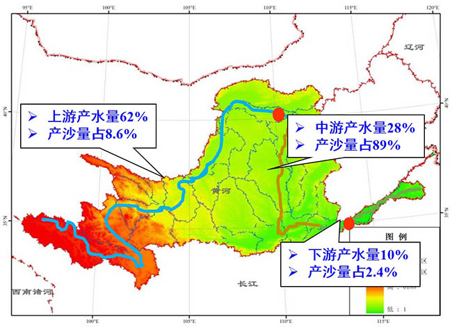 黄河水沙异源,泥沙主要来自中游的河口镇至三门峡区间,来沙量占全河的89.1%,来水量仅占全河的28%;河口镇以上来水量占全河的62%,来沙量仅占8.6%。